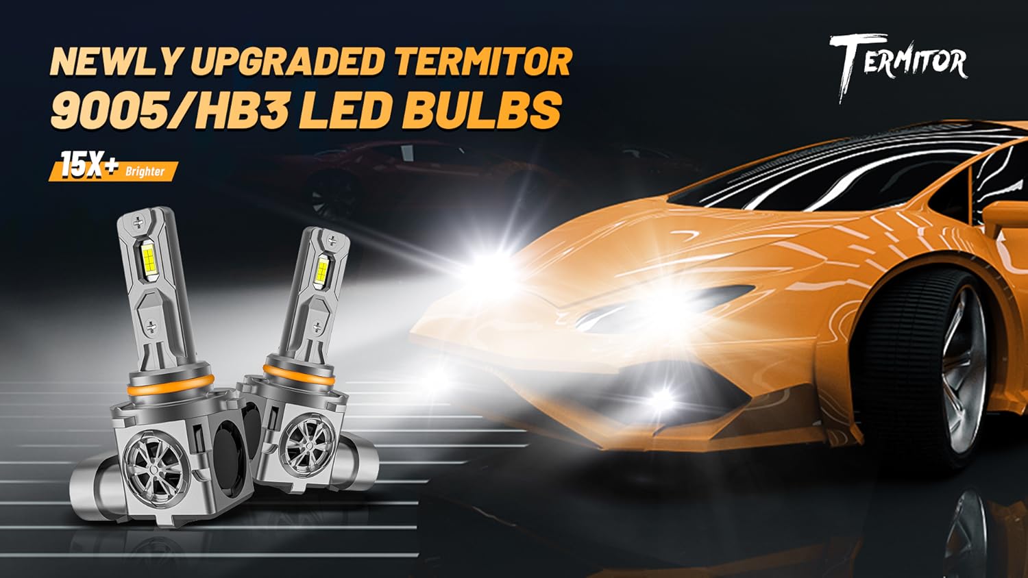 Upgrade your driving experience with Termitor 9005/HB3 LED headlight bulbs. These ultra-bright 80,000LM bulbs deliver 12X brighter illumination than standard halogens with a crisp 6500K cool white light. Featuring plug-and-play installation, IP68 waterproof rating, and 80,000+ hour lifespan.