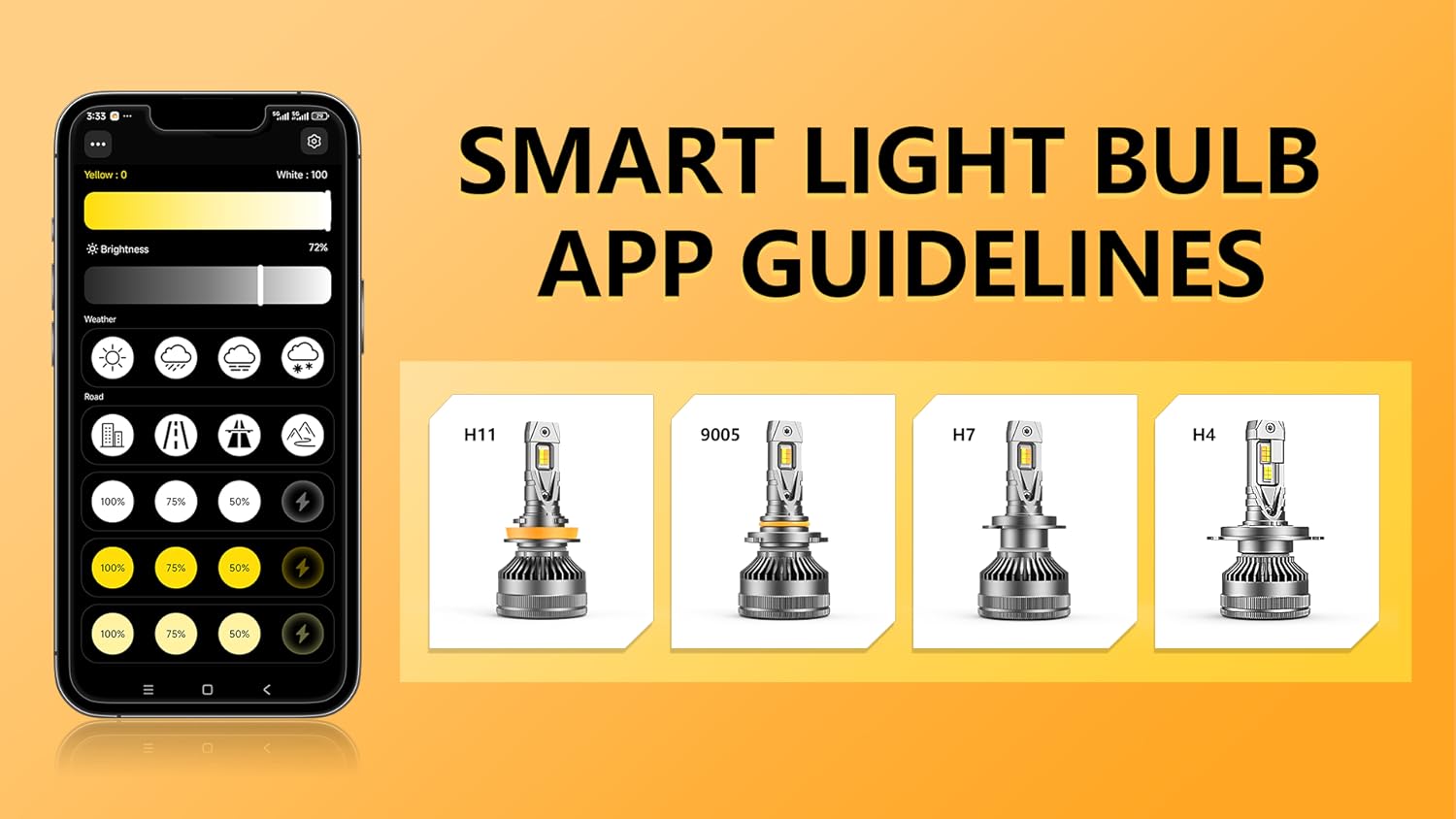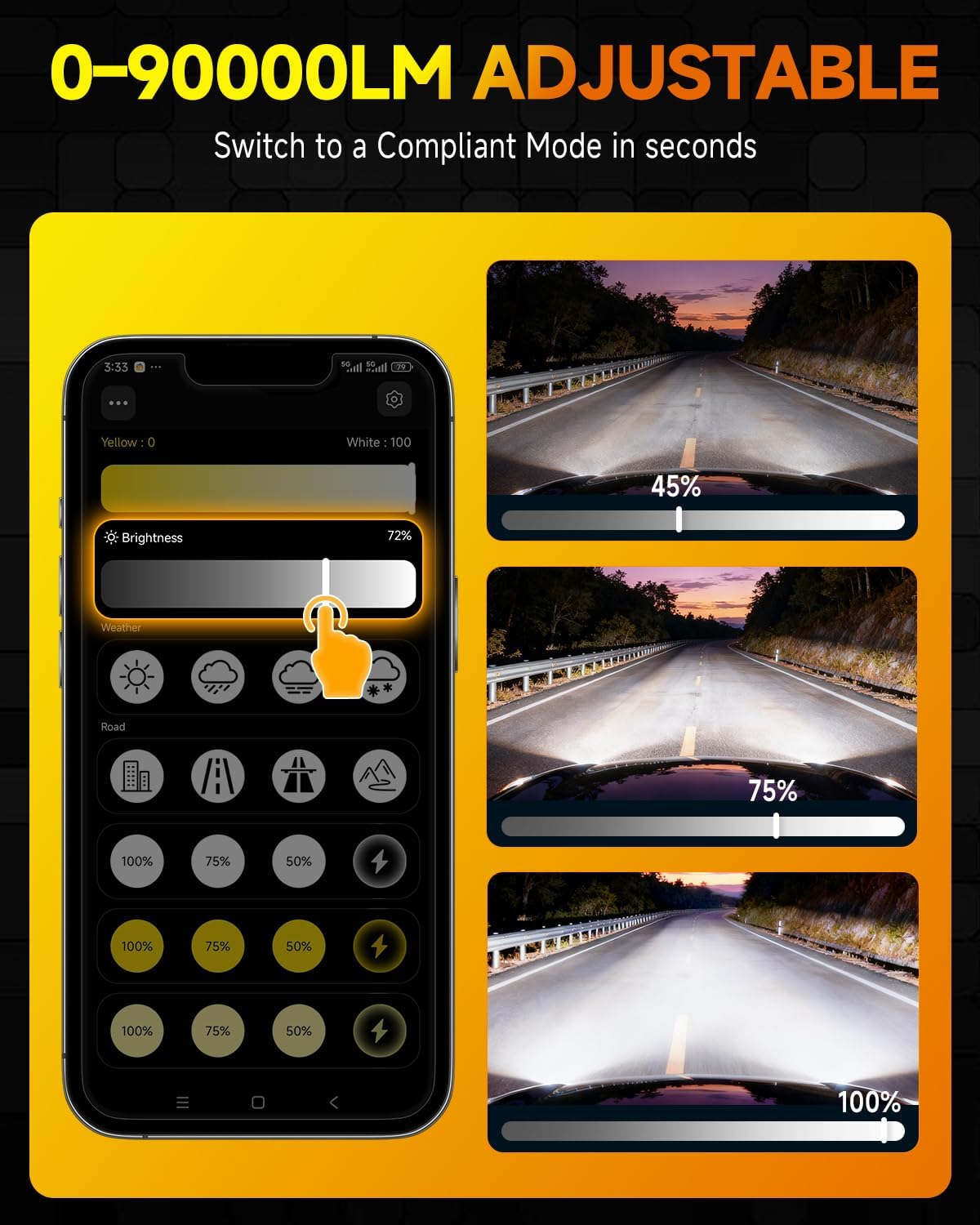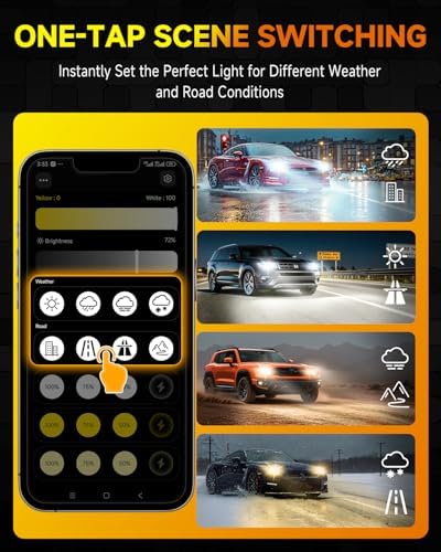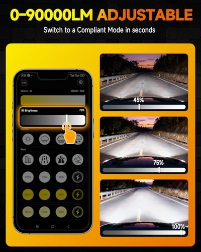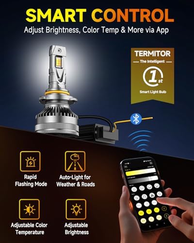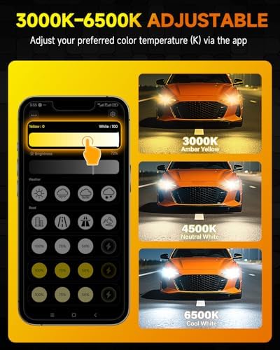 Experience complete control over your headlights with the Termitor smart app. The intuitive interface lets you adjust brightness from 0% to 100% with a simple swipe, allowing you to customize your lighting based on driving conditions. Navigate city streets with moderate brightness or illuminate pitch-dark country roads with full power. The app also enables adjustment of color temperature from warm yellow (3000K) to crisp white (6500K), making these bulbs incredibly versatile. Use warmer tones to cut through fog and adverse weather conditions or switch to cooler white light for maximum clarity on dark highways. This all-in-one solution eliminates the need for separate fog lights and specialized weather illumination.