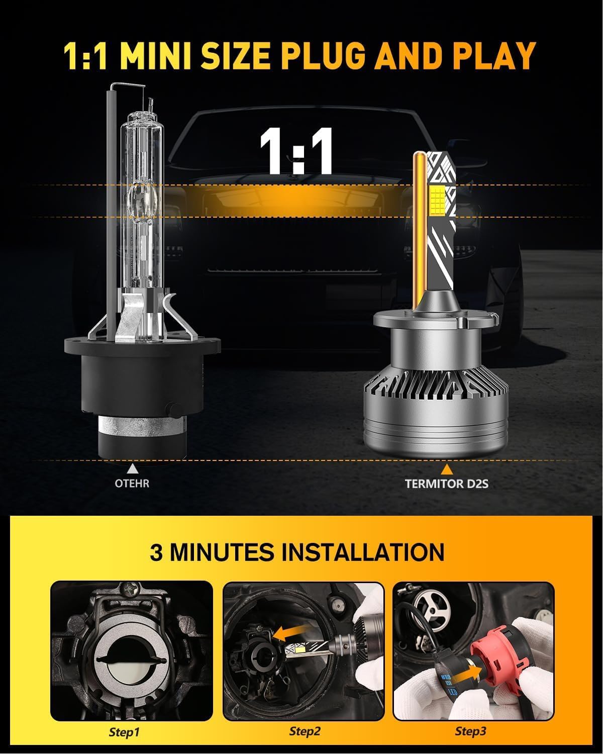 The FAHREN Termitor D2S HID replacement bulbs are designed for hassle-free installation with perfect compatibility. Engineered as direct replacements for stock D2S bulbs, they match the exact dimensions of OEM bulbs for a seamless fit in your vehicle’s existing housing. The ultra-skinny design features a 30% thinner plug and compact base that free up valuable engine bay space. Installation requires no wiring modifications, no specialized tools, and no vehicle alterations—simply remove your old bulbs and plug in the new FAHREN Termitor units. Most drivers complete the entire installation process in 5 minutes or less, and the bulbs offer 99.9% vehicle compatibility with zero dashboard error codes for most models.