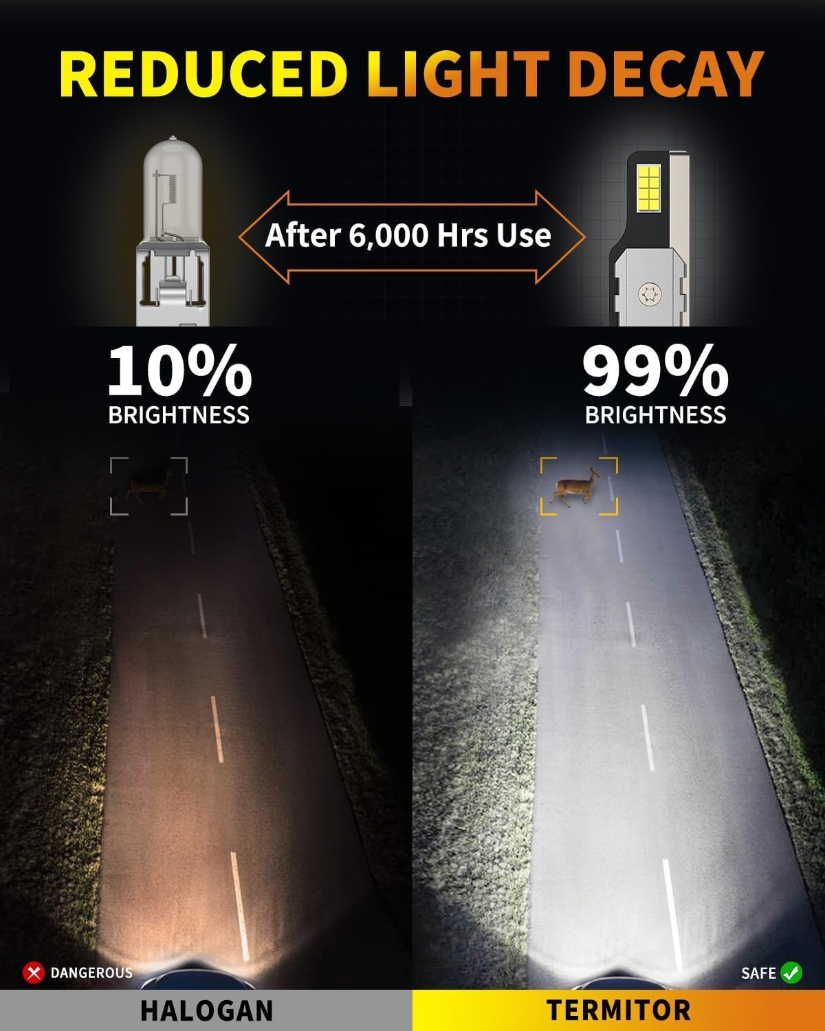 The TERMITOR H1 LED bulbs harness cutting-edge technology to produce an impressive 36,000 lumens of light output. Featuring 16 advanced CSP (Chip Scale Package) chips, these bulbs create a powerful beam that cuts through darkness with remarkable efficiency. The specialized Z10 technology ensures stable, consistent illumination that won’t flicker or fade, even during extended use. With a crisp 6500K color temperature, these bulbs provide a clean white light that closely mimics natural daylight, reducing eye strain and improving depth perception during nighttime rides.