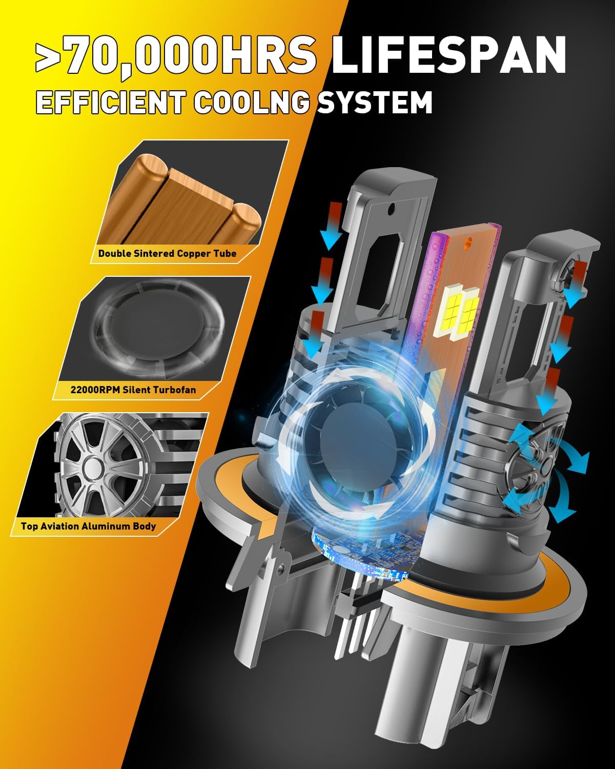 FAHREN engineers have developed an unrivaled thermal management system for these H13 LED bulbs. Constructed with premium aviation-grade aluminum and featuring a thermostatic copper plate, these components work in harmony with a high-speed 20,000RPM cooling fan to dissipate heat rapidly and efficiently. This advanced cooling technology prevents performance degradation and ensures a remarkable 70,000+ hour lifespan per bulb, providing years of consistent, bright illumination without the need for frequent replacements. The intelligent temperature control maintains optimal performance in various driving conditions, from extreme cold to scorching heat.